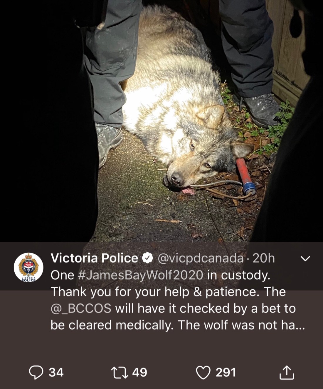 We knew there was a wolf in James Bay, the area of Victoria where my sister lives. Its presence in this urban environment was unheard of, so had been all over the news and social media the day before, when several people snapped pictures and a neighbour on her street had videoed it loping down the sidewalk in the middle of the day. When I had texted her that I was walking over, I had even joked that I hoped the wolf didn’t get me. And when the walk took longer than I predicted, she asked if I had been eaten?