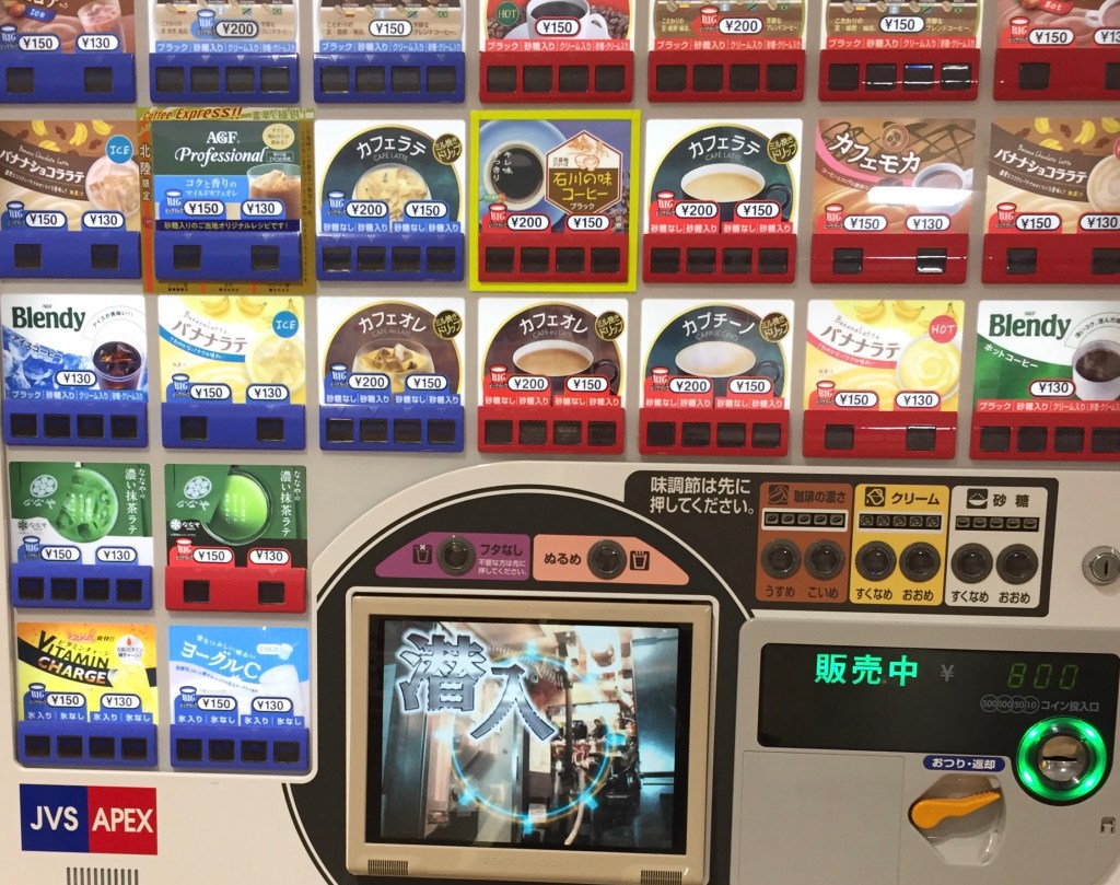 Which would you choose? One of a bank of vending machines in Kanazawa train station, June 2019