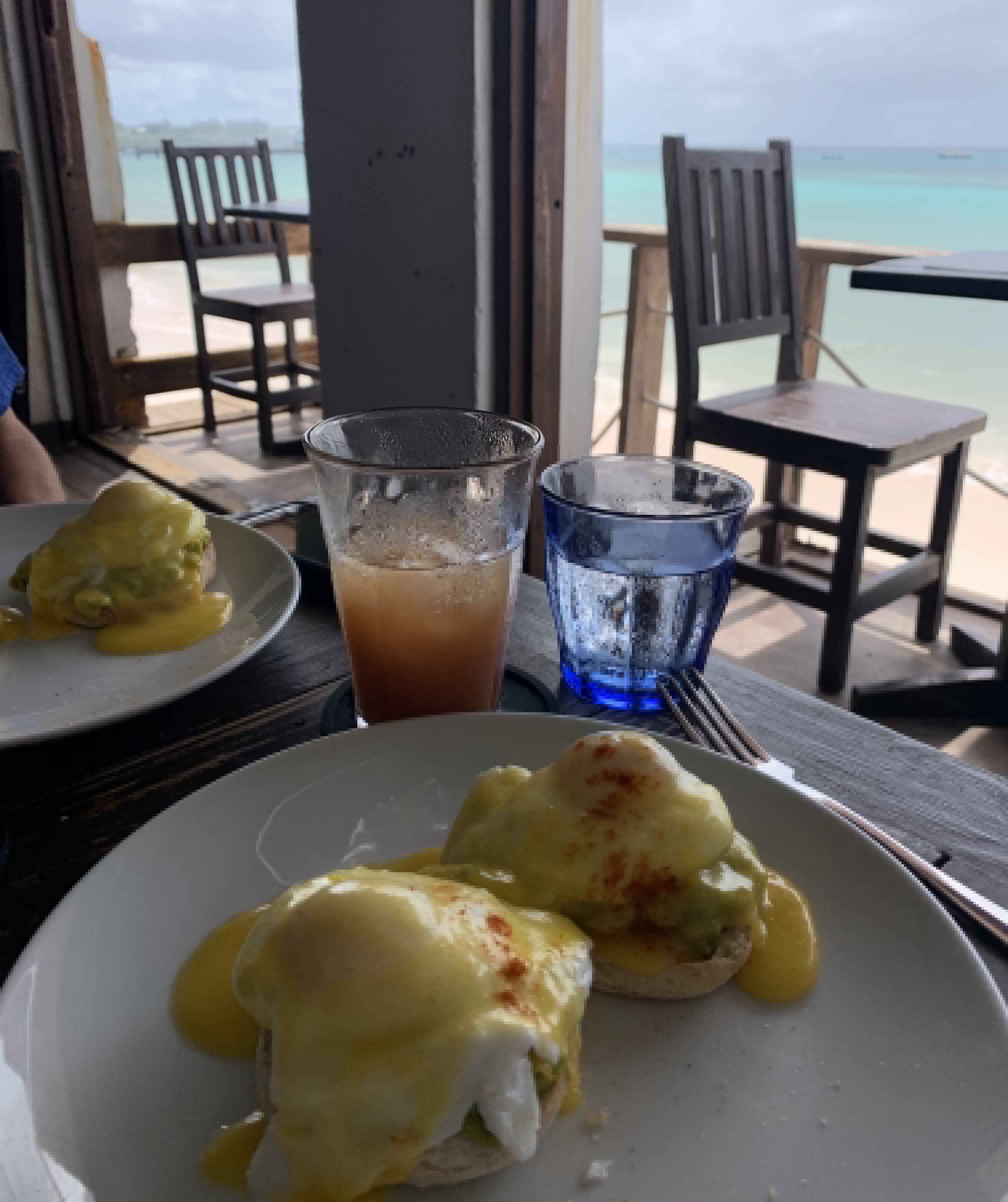 First stop is Surfer’s Cafe. At the door they check our temperature and have us write down our contact information. We’re offered a table on the deck that hangs over the beach but have discovered it gets too hot when the sun is out, so sit inside. We order their excellent avocado Eggs Benny, and have a side of buljol, which is like ceviche but made with salt fish instead of raw.