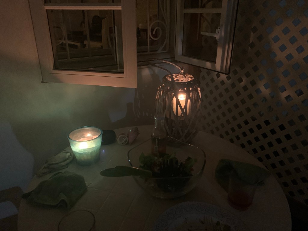 I sit outside until the dusk mosquito fest begins, but by the time the soup is ready it’s seven and full dark, so we head outside again with a citronella candle and eat. The papaya soup is amazing: thick, creamy, full of flavour but not sweet.