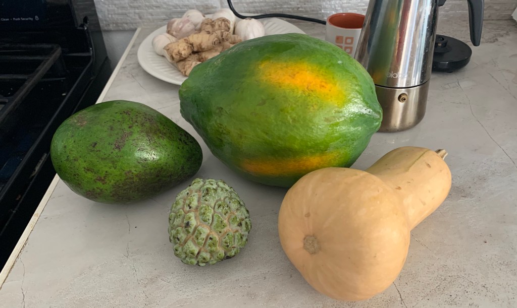 The tiny one in front is a sugar apple. Other islands call it a star apple I think. Can make punch like with the Soursop. Lol, there are probably proper names for these.