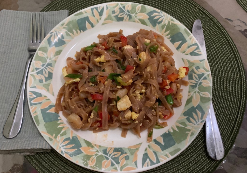 There were so many limes in September when I arrived that you could buy a bag of the fruit for $5BBD ($2.50USD). The Barbadian limes are smaller, juicier and more flavourful than the ones I’m used to, but they are not in season now, so we have been making do with the more expensive imported limes. I wanted to make Pad Thai. I had found both rice noodles and fresh cilantro (coriander) on the weekend, so thought that was a sign. I’d considered substitutes for fish sauce (Worcestershire sauce and reduced sugar in the recipe) and bean sprouts (lentil sprouts have the same neutral crunch and are less watery). All I needed was limes.