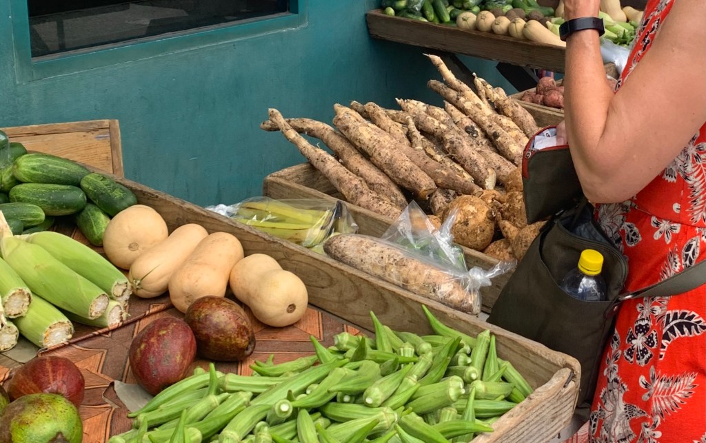 There is no lack of food products or produce, however. I’m surprised by how many familiar Canadian products I see on the shelves, and at the variety of British foodstuffs. We have been happily exploring Bajan sauces, vegetables and recipes. We’ve tried cassava and many other different root vegetables, exotic fruit I’d never even heard of before, let alone seen. Scott’s green papaya soup has become a favourite, and we prefer the less-sweet, local sweet potatoes, as well as the true African yams.