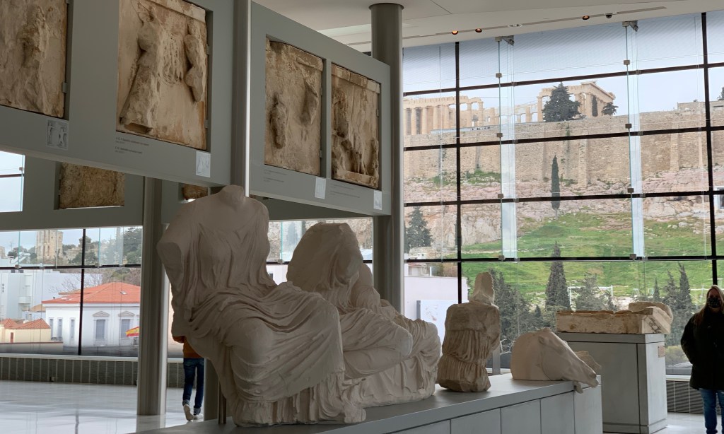 We spent a whole afternoon at the Parthenon Museum. There was time to read the signs and watch the videos, developing a feel for millennia of history of the Acropolis, of Athens, of Greece, of the Mediterranean. Seeing the marbles of the friezes and pediments placed exactly how they would have been on the Parthenon gave a true sense of the size and grandeur of the ancient temple. It was particularly poignant to see the plaster casts filling so much of the lines of carvings, holding space for those taken by Lord Elgin and still in the British Museum. We had seen that display a week before in London, and recognized many of the pieces.
