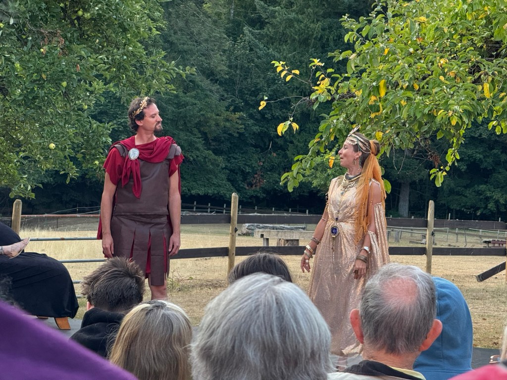 It was intermission at the outdoor performance of “A Comedy of Errors.” I spotted Christine by the horse paddock when I was at the concession, and it was time for us to catch up.